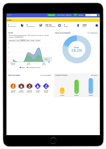 Chaque utilisateur a accès à son profil personnalisé avec le nombre d’unités en cours et complété. Il peut visualiser le résultat de son investissement personnel avec le nombre d’heures passé en ligne, les points accumulés et son niveau de progrès en ligne.
